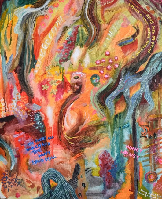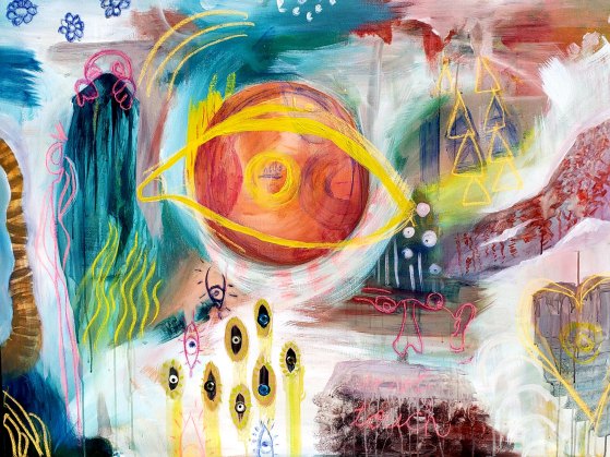 Although Rouck has fun illustrating human-birds, lately she has been enjoying placing a brush on canvas and creating abstract paintings. “The abstract ones are part of my soul, that’s why I like those ones a little bit more,” she noted. “Art comes from a moment, and sometimes that can be expressed within a topic or sometimes you just scribble and paint a bunch of words that don’t make any sense.”